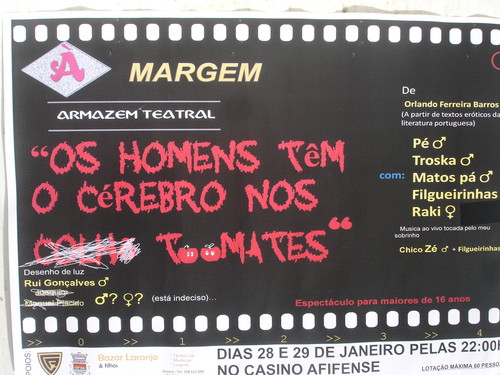 A Companhia À Margem Armazém Teatral, vai apresentar nos dias 28 e 29 no casino Afifense a peça “Os homens tem o cérebro nos tomates” a partir dos textos eróticos da literatura Portuguesa de Orlando Ferreira Barros. Esta será uma maneira diferente de fazer teatro, onde apenas haverá lotação para 60 pessoas em que os sócios vão pagar quatro euros e os não sócios cinco. A peça vai ser interpretada pelo, Pé, Troska, Matos Pá, Filgueirinhas e Raki, terá ainda musica ao vivo tocada pelo Chico Zé e Filgueirinhas. O espectáculo é para maiores de 16 anos. Esta é a segunda peça apresentada pela companhia no Casino Afifense, até porque esta tem estado sedeada e feitos os seus ensaios na associação. Os bilhetes serão colocados à venda no bar do Casino Afifense, a partir do dia 24 e só 120 pessoas é que vão poder assistir a esta peça, nestas duas representações previstas para este mês. Todos os atores, são experientes e já passaram pelas mais diversas companhias de teatro da região e não só, o que à partida garante desde logo a qualidade do espectáculo.