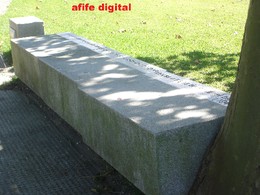 Banco de granito de centenas de quilos, está a ser movido, pelo crescimento de uma arvore. Isto acontece no jardim de Empostalha. |