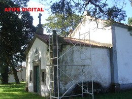 Pirâmide de uma beira do telhado da Capela da Rocha,está a ser recuperada, depois de um ramo de uma arvore a ter feito tombar em cima do telhado, partindo as telhas e assim esteve há mais de um ano |